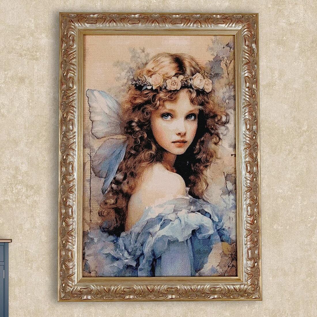 Завораживающая красота романтичного образа феи передана через каждый элемент вышивки. Нежные оттенки голубого в воздушном платье гармонично сочетаются с золотисто-карамельными локонами, увенчанными изящным венком из белоснежных роз. Лучистые глаза небесного цвета притягивают взгляд благодаря мастерски подобранным теням и полутонам.