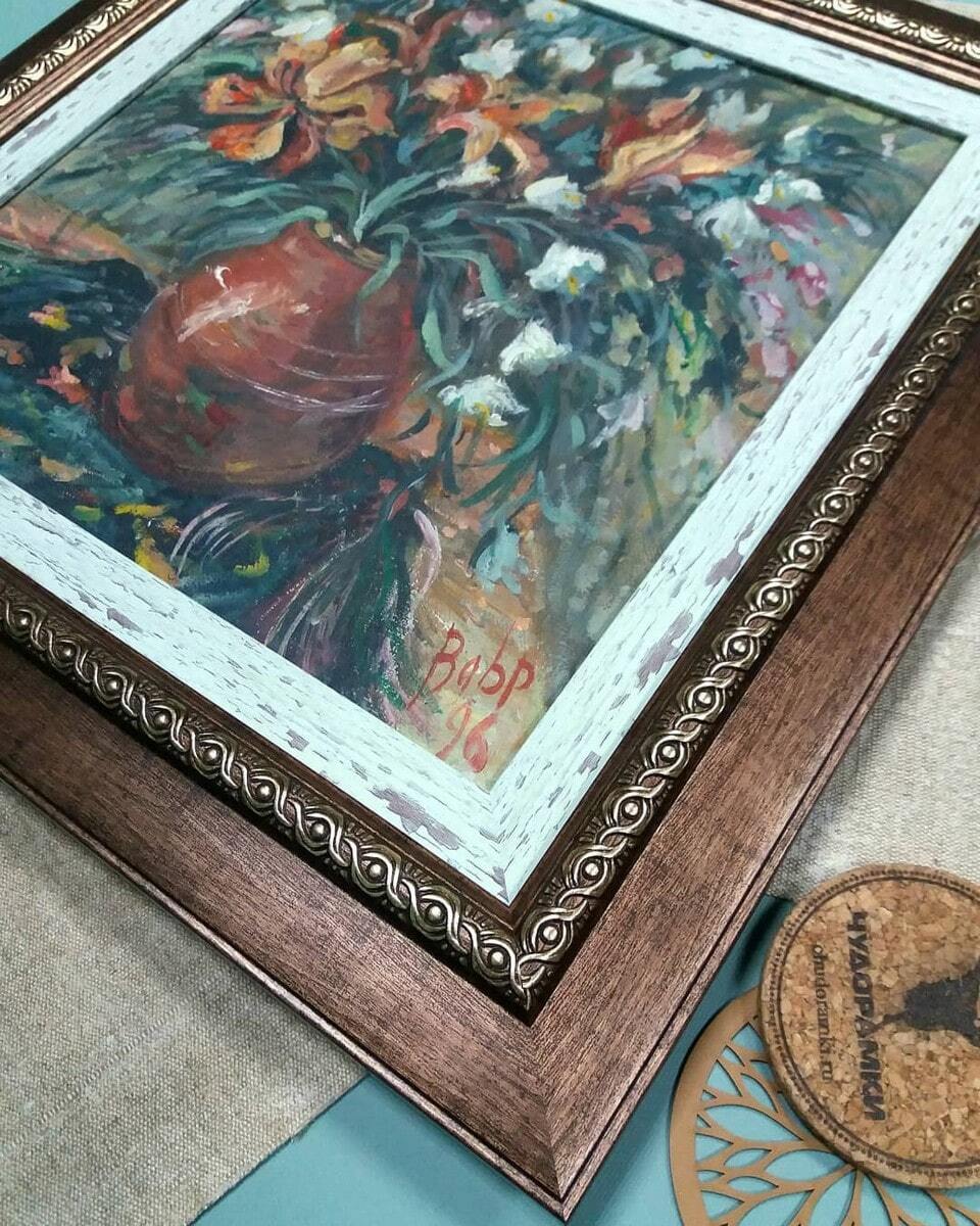 Консультанты тщательно подобрали сочетание профилей, чтобы подчеркнуть колорит картины – теплые коричневые оттенки внешней рамы перекликаются с вазой, а белая внутренняя рамка оттеняет яркие цветы и создает легкую воздушность.